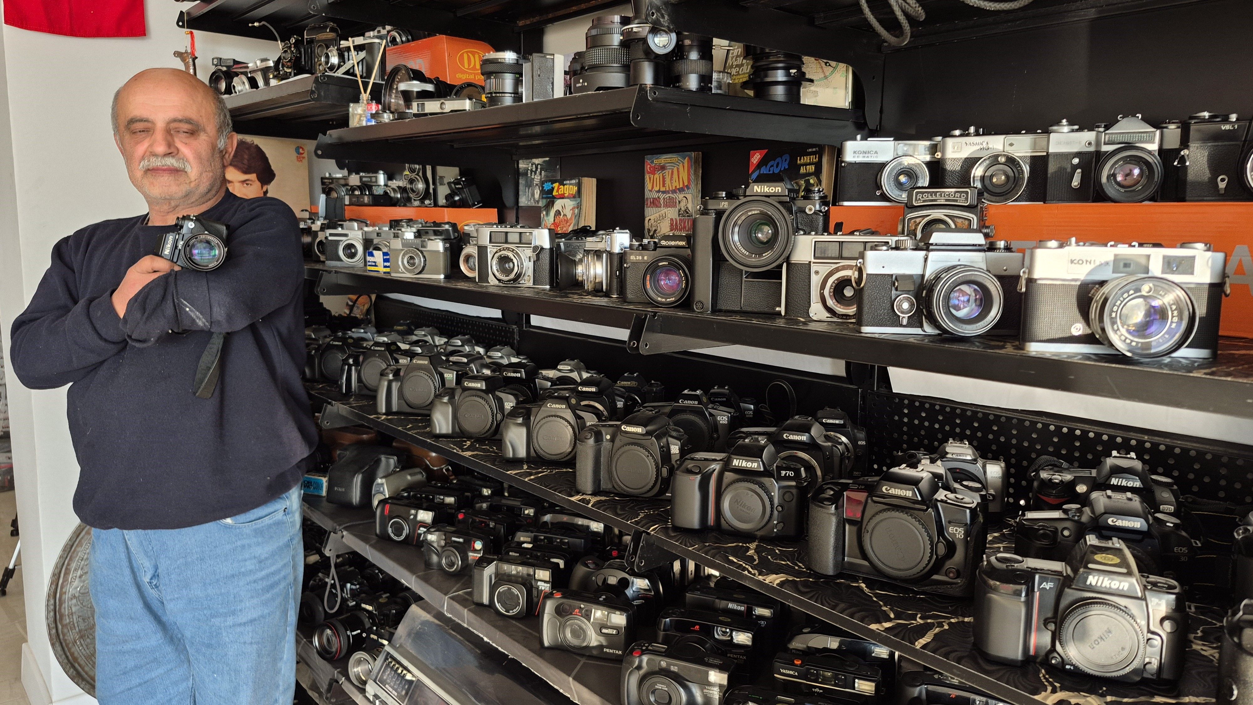 Düzce'de yaşayan Mehmet Aygün, makine koleksiyonuyla fotoğrafçılığa ışık tutuyor. Tam 41 yıldır fotoğrafçılık yapan Aygün sahip olduğu makine koleksiyonuyla 1930'lu yıllardan dijital döneme kadar 200'den fazla fotoğraf makinesiyle dikkat çekiyor.