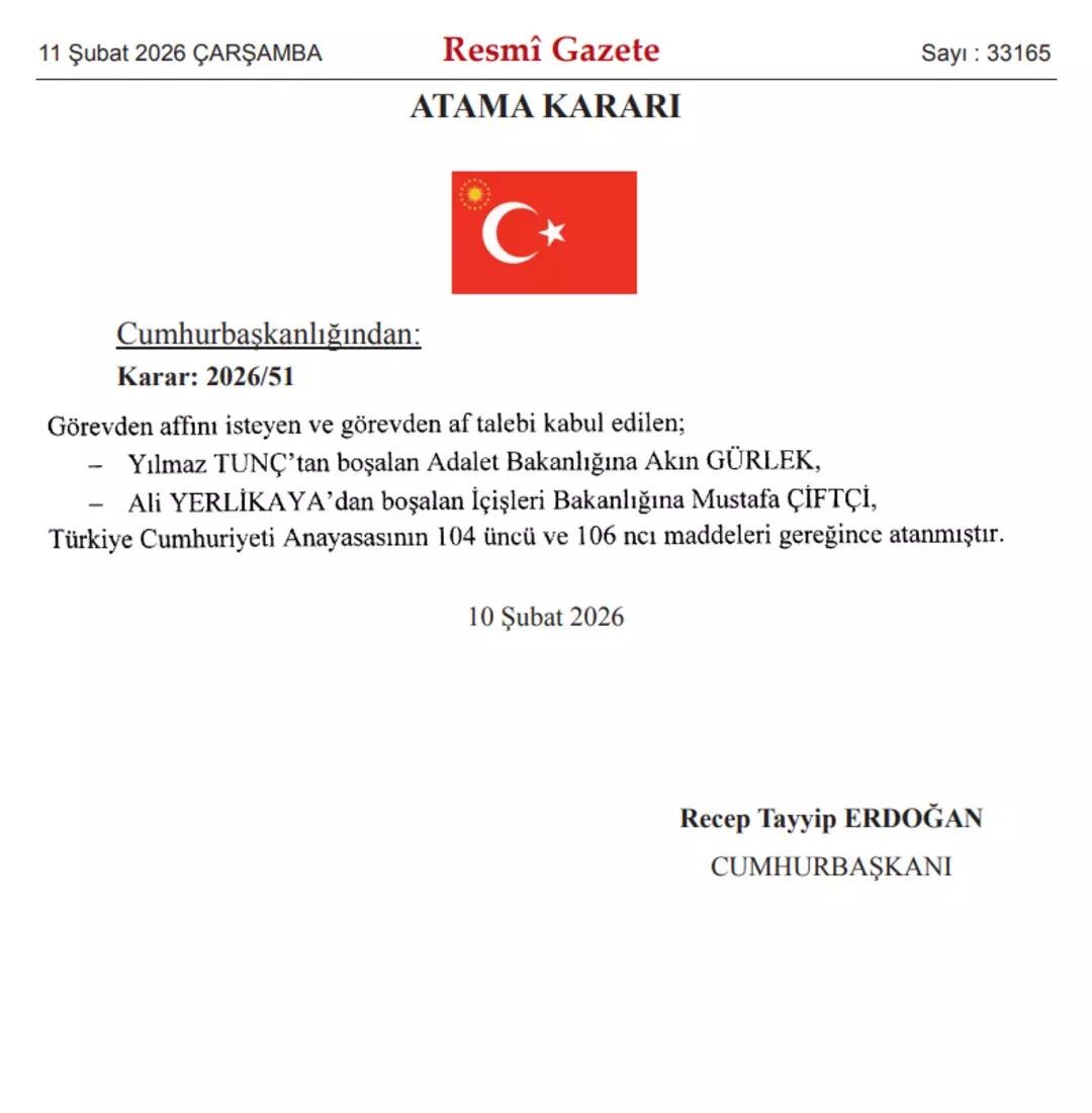 Resmi Gazete’de yayımlanan Cumhurbaşkanı kararlarıyla kabinede değişikliğe gidildi. Cumhurbaşkanı Recep Tayyip Erdoğan’ın imzasıyla yayımlanan atama kararlarına göre, Adalet ve İçişleri Bakanlıklarında görev değişimi gerçekleşti.