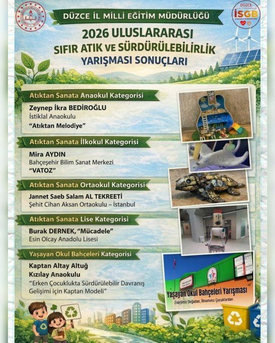 Düzce İl Milli Eğitim Müdürlüğü tarafından, İş Sağlığı ve Güvenliği Birimi koordinesinde düzenlenen “2026 Uluslararası Sıfır Atık ve Sürdürülebilirlik Yarışması”nın sonuçları açıklandı.