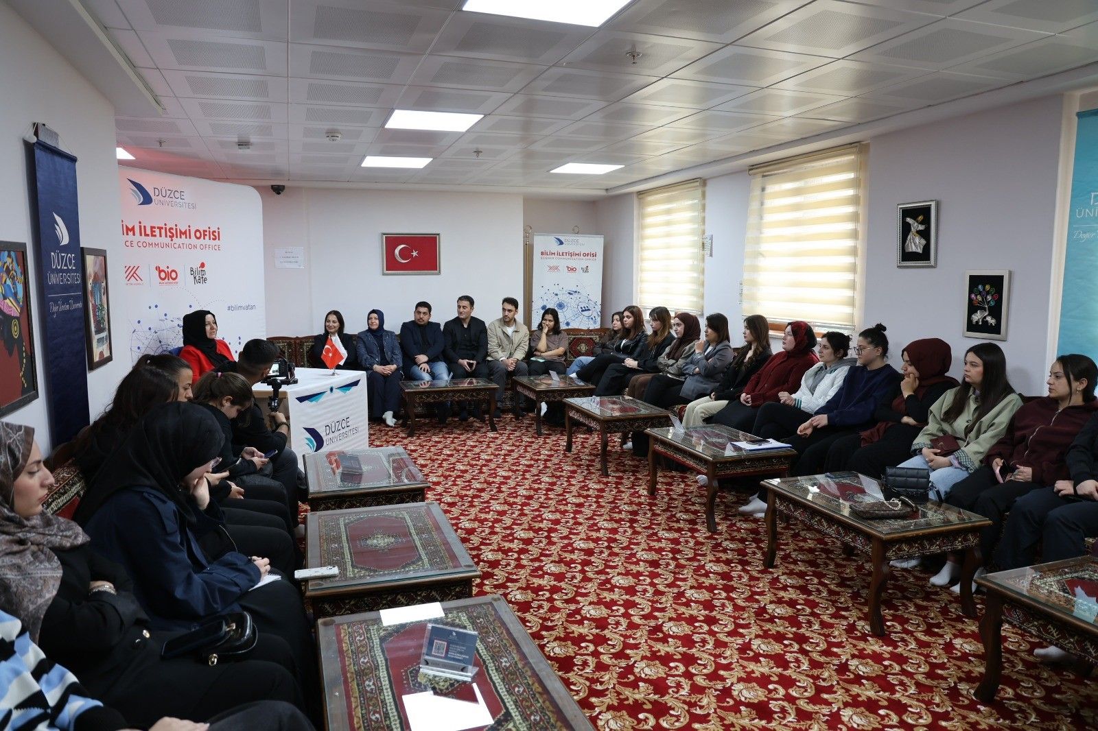 Düzce Üniversitesi Bilim İletişimi Ofisi ile Toplumsal Katkı Koordinatörlüğü tarafından Düzce Gençlik ve Spor İl Müdürlüğü iş birliğinde düzenlenen "Bilim Kafe" etkinlikleri, toplumla bilimi buluşturmaya devam ediyor. Raziye Begüm Sultan Kız Yurdu’nda düzenlenen Bilim Kafe buluşmasında bu defa "Değerlerle Liderlik" konusu ele alındı.