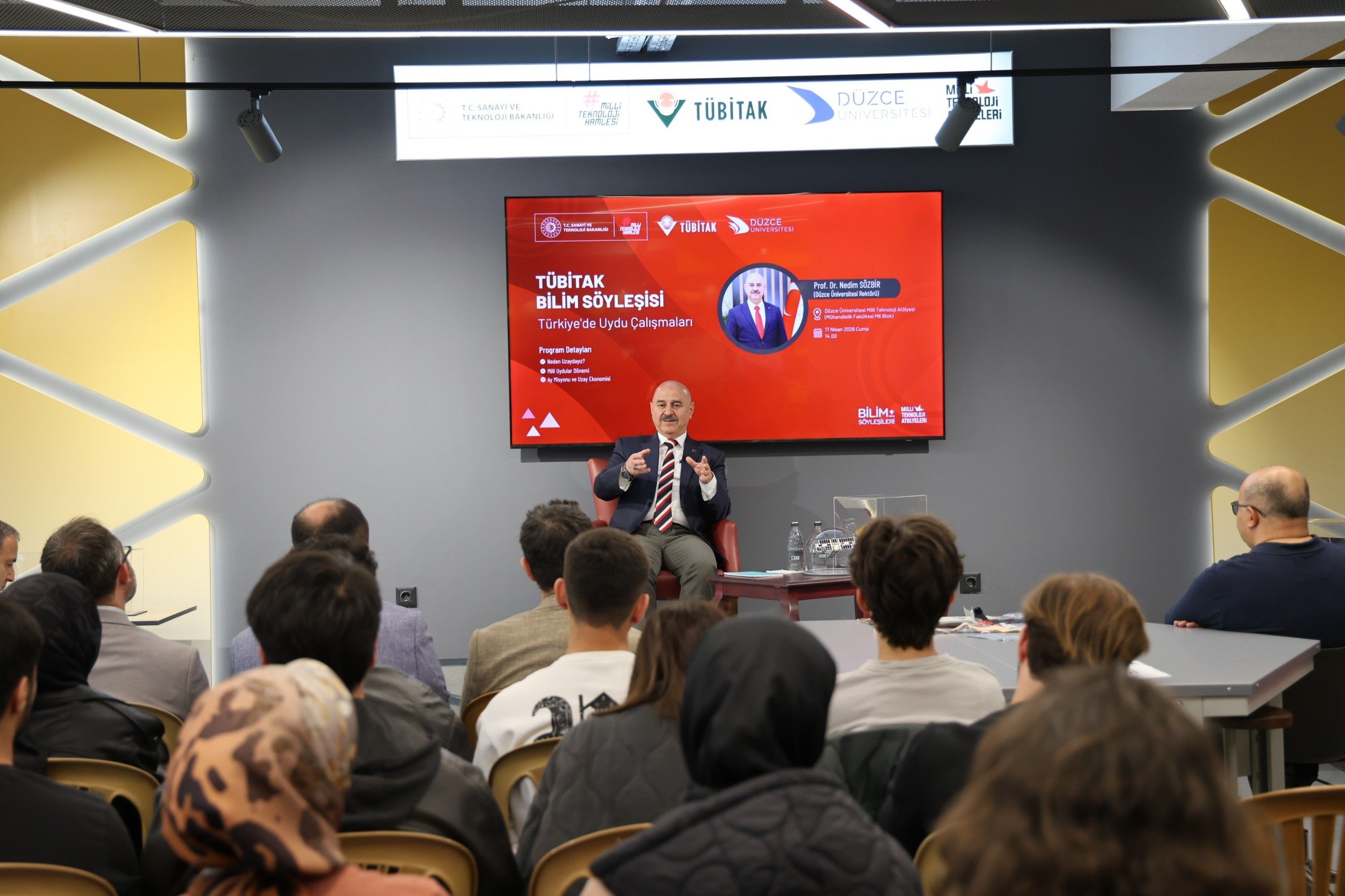 Düzce Üniversitesi Rektörü Prof. Dr. Nedim Sözbir, TÜBİTAK Bilim Söyleşisi kapsamında Düzce Üniversitesi Milli Teknoloji Atölyesi’nde öğrencilerle bir araya gelerek "Türkiye’de Uydu Çalışmaları" konusundaki bilgi ve deneyimlerini paylaştı.