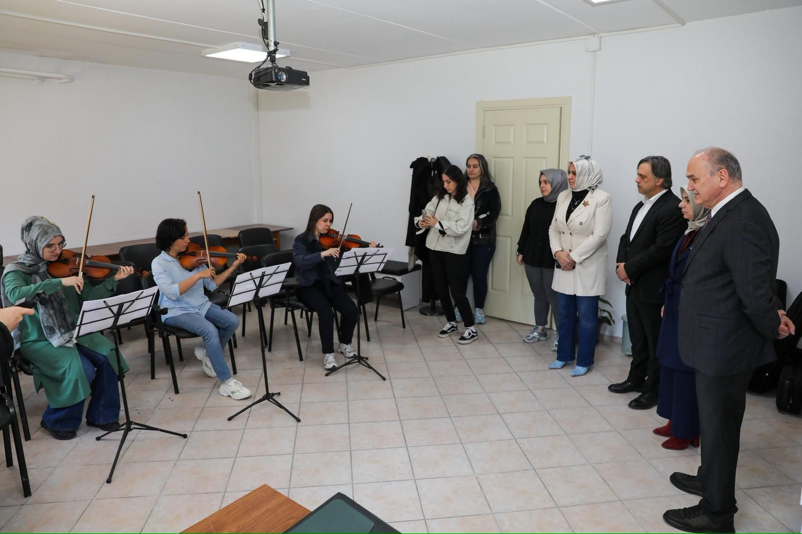 Belmek’i ziyaret eden Düzce Belediye Başkanı Dr. Faruk Özlü de kursiyerlerin müzik dinletisine eşlik ederek pastacılık kursuna katılan kursiyerlerle sohbet etti. Daha sonra İl Milli Eğitim Müdürü Gülşen Özer ve İl Müftüsü Osman Aydın’ın da eşliğinde diğer kursiyerleri ziyaret ederek öneri ve taleplerini dinleyen Başkan Özlü, kurumlar arası iş birliği halinde kurs branşlarını geliştirmek için gerekli düzenlemelerin yapılacağını ifade etti.