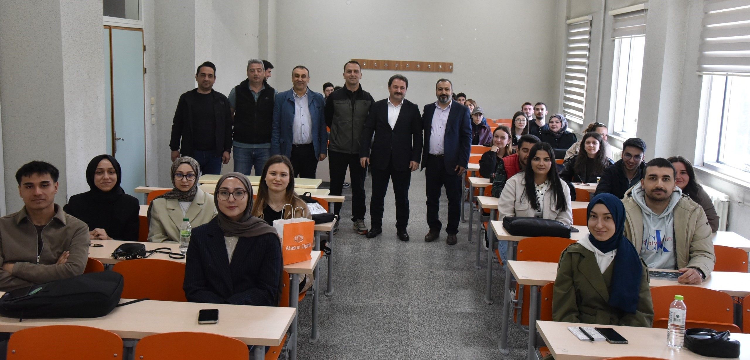Orman Fakültesi Orman Mühendisliği Bölümü ile Kariyer Geliştirme ve Mezun İzleme Uygulama Araştırma Merkezi iş birliğinde düzenlenen "Ormancılıkta Transport: Kesimden Depoya Yeni Gelişmeler" başlıklı konferans, Düzce Orman İşletme Müdürü Orman Yüksek Mühendisi Murat Yıldız ve Aksu Orman İşletme Şefi Orman Yüksek Mühendisi Mustafa Görkem Ciritcioğlu’nin katılımıyla gerçekleştirildi. Konferansın açılış konuşmasını yapan Orman Fakültesi Dekan Yardımcısı Prof. Dr. Yılmaz Türk, ormancılık teşkilatının üniversite ile güçlü bir iş birliği içerisinde olduğunu vurgulayarak, mesleki gelişmelerin sahadan gelen uzmanlar aracılığıyla öğrencilere aktarılmasının önemine dikkat çekti.