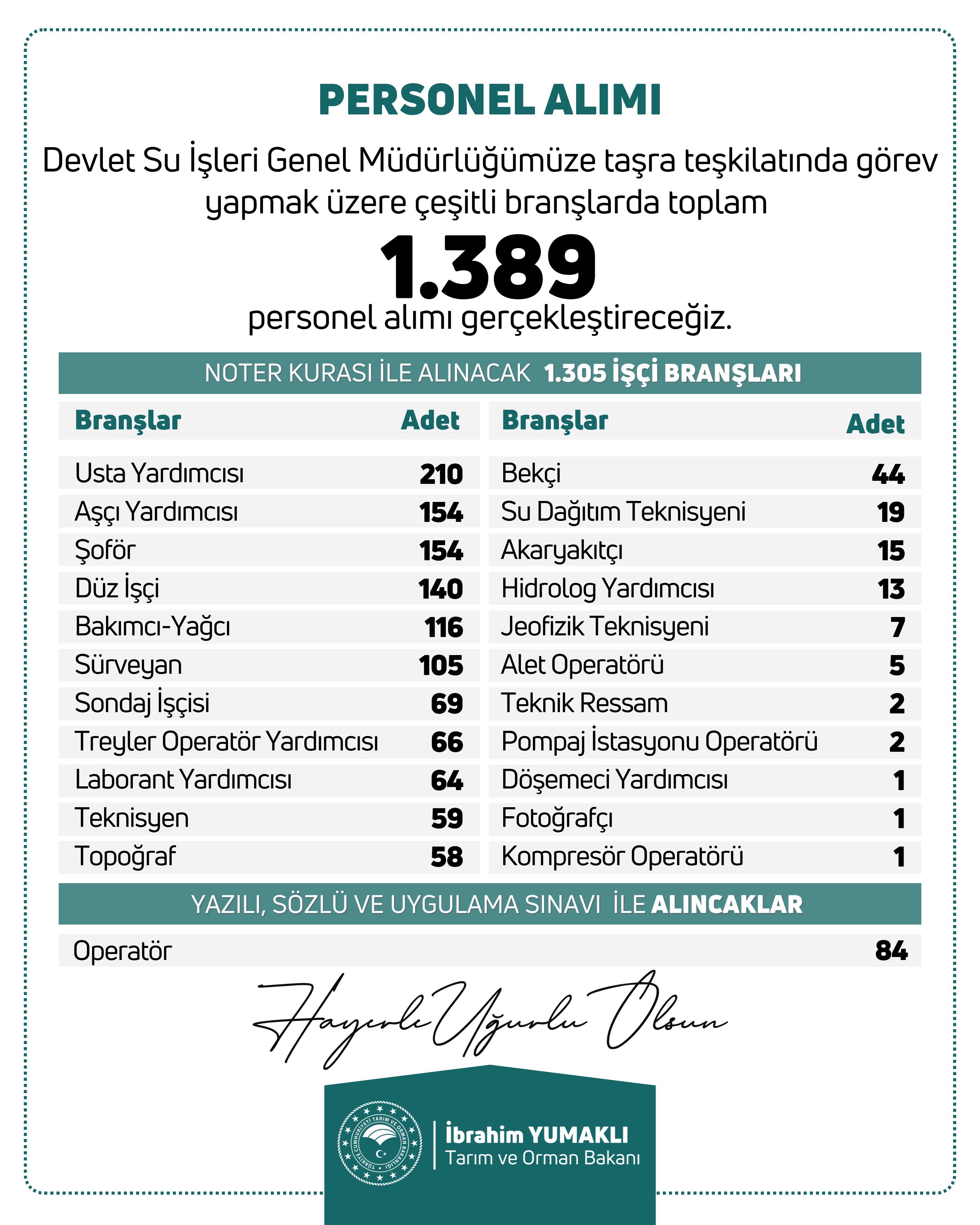 “Devlet Su İşleri Genel Müdürlüğümüzün taşra teşkilatında görev yapmak üzere 1.389 personel alımı gerçekleştireceğiz. Ülkemizin dört bir yanında görev alacak yeni çalışma arkadaşlarımıza şimdiden kolaylıklar diliyorum.” ifadelerine yer verdi.