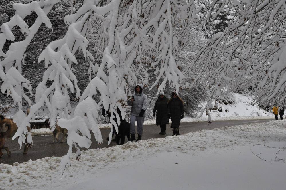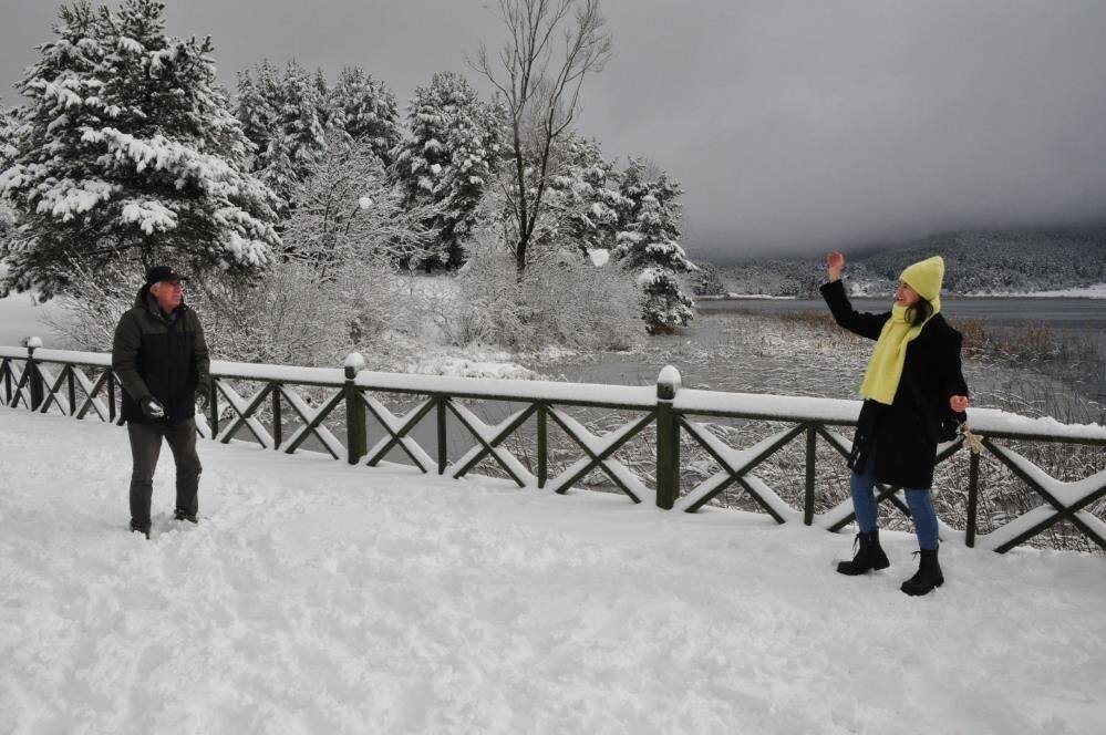 Kar yağışına ve soğuk havaya aldırış etmeyen doğaseverler, göl çevresinde bulunan parkurda yürüyerek ve kar topu oynayarak karın tadını çıkardı.
