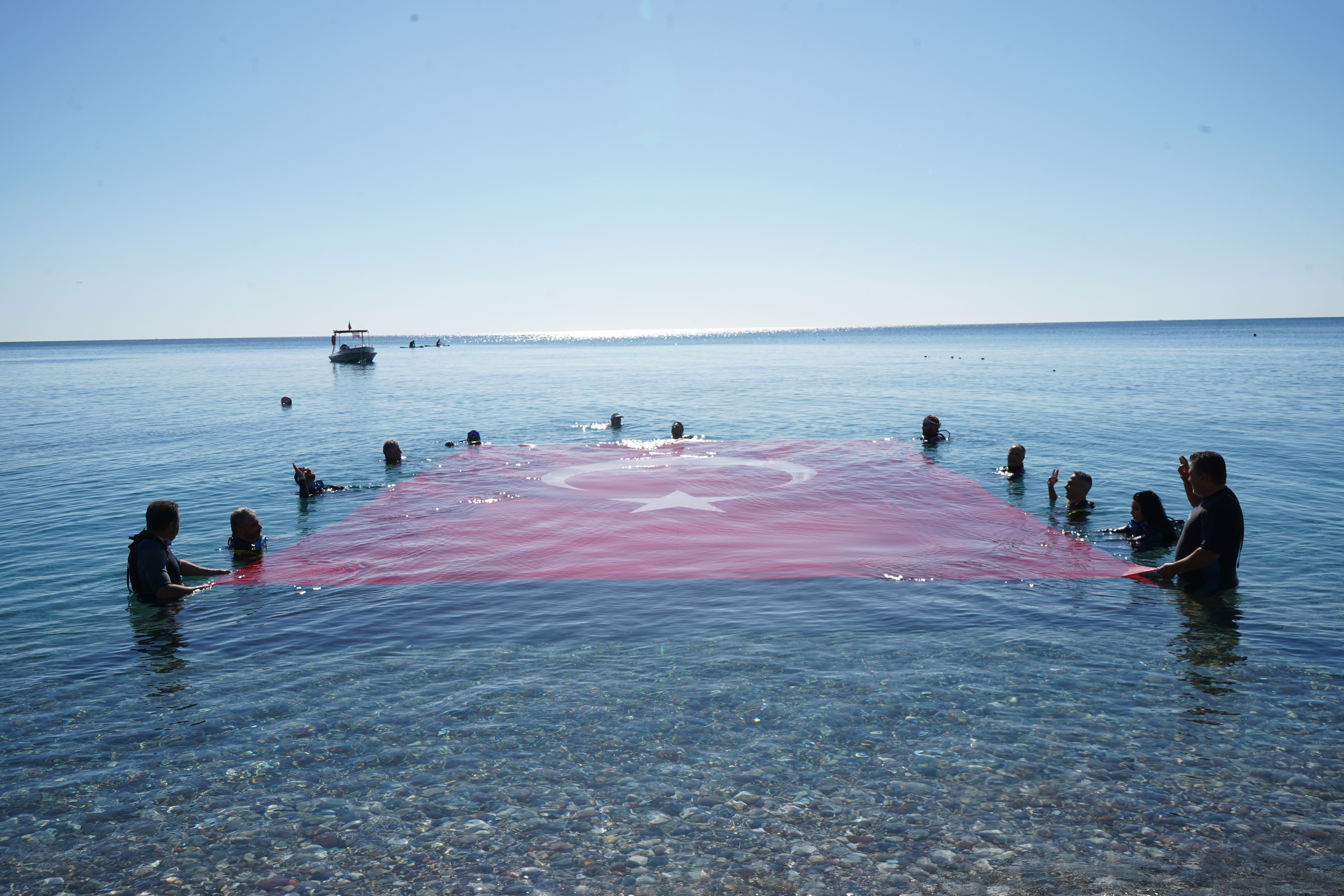 ANTALYA'da Cumhuriyet'in 102'nci yılı kutlamaları kapsamında deniz altında ve üstünde Türk bayrağı açıldı. Kutlamalar, dev bayrağı dalgalandırarak karada da devam etti.