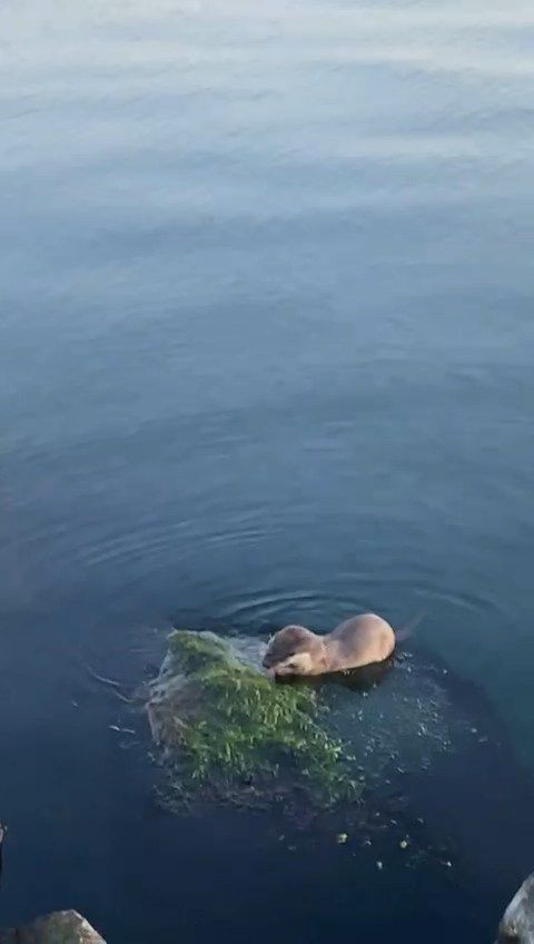 Hemen yakın bir noktada ise bir kişi su samurunu, kayalıkların üzerinde tuttuğu balığı yerken görüntülendi.