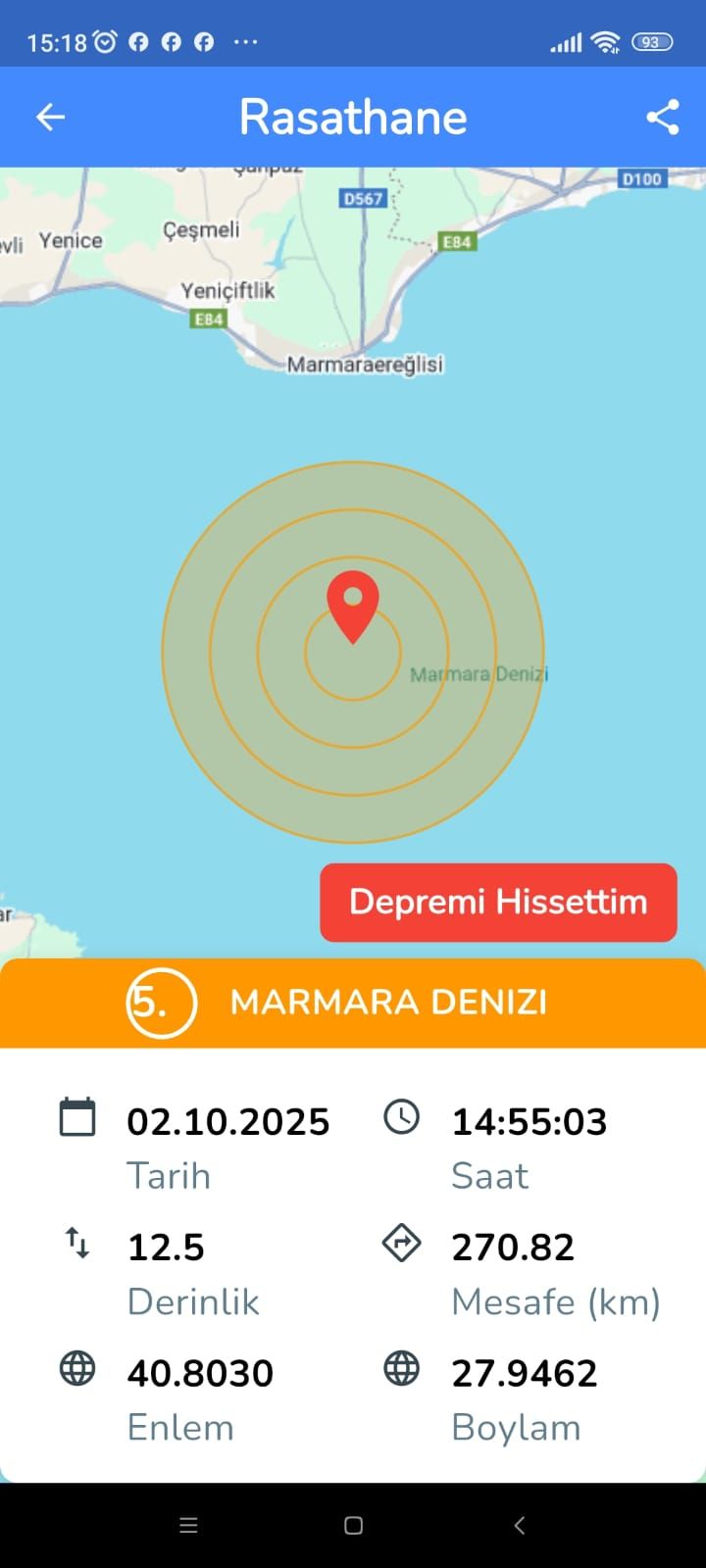 İstanbul'da şiddetli bir deprem meydana geldi.EMSC verilerine göre denizde Çorlu açıklarında 5,0 büyüklüğündeki deprem meydana geldi.