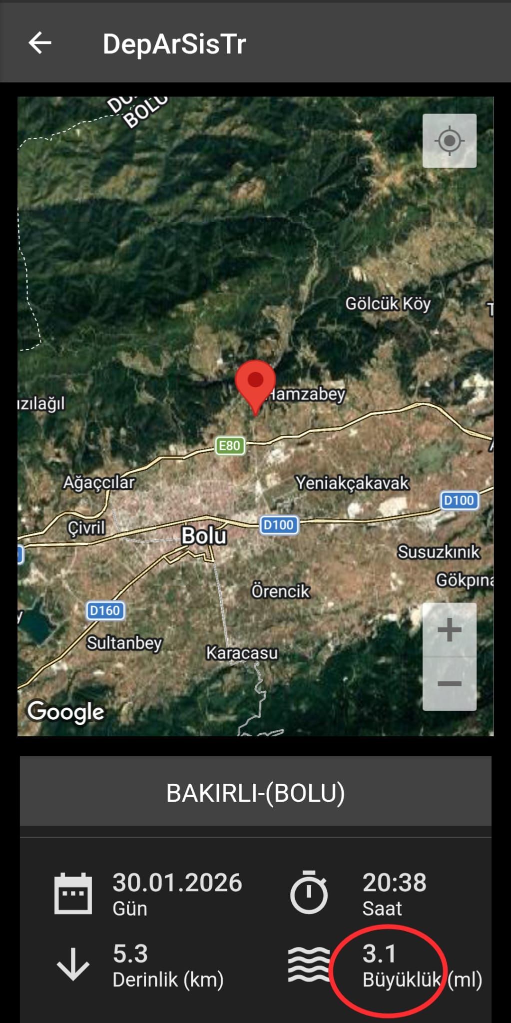 Bolu’nun Bakırlı mevkiinde 30 Ocak 2026 tarihinde saat 20.38’de bir deprem meydana geldi. Yerin yaklaşık 5,3 kilometre derinliğinde gerçekleşen ve 3 ,1 büyüklüğü civarında olduğu bildirilen deprem, kent merkezi ve çevre ilçelerde hissedildi.