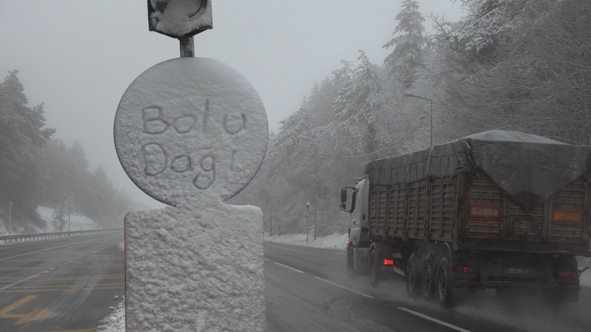 BOLU Dağı geçişinde hafif kar yağışı aralıklarla etkili olurken, yeşil alanlar beyaz örtüyle kaplandı. D-100 kara yolu geçişinde sis nedeniyle görüş mesafesi yaklaşık 30 metreye kadar düştü.