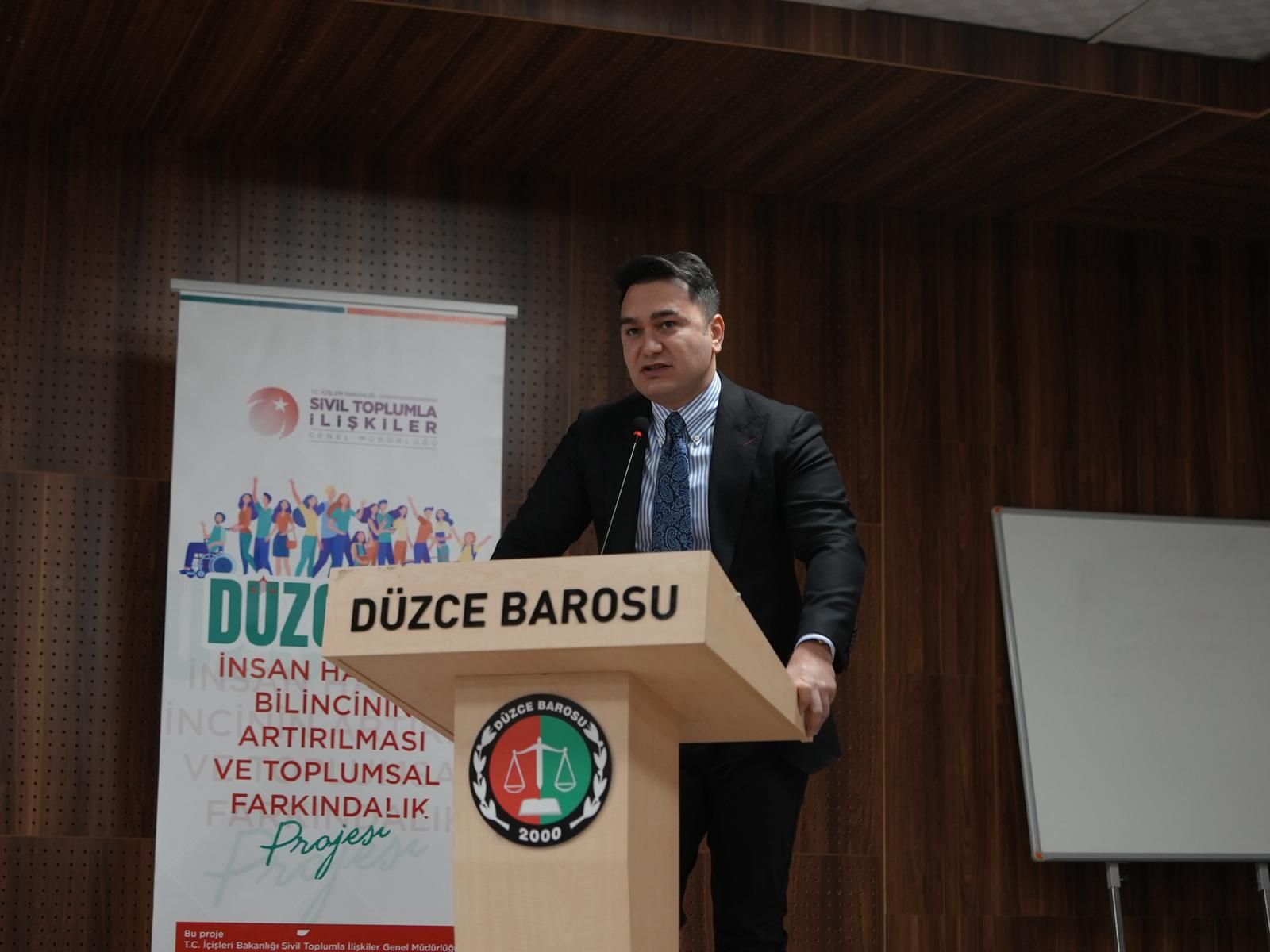 Düzce Barosu ve Düzce Sosyal Etkinlikler Derneği (DÜSED) işbirliği ile yürütülen, İçişleri Bakanlığı Sivil Toplumla İlişkiler Genel Müdürlüğü’nün de destek verdiği projenin önemli bir ayağı olan proje kapsamında, Düzce Barosu Konferans Salonunda gerçekleşen etkinliğe, Düzce Cumhuriyet Başsavcısı Yasin Emre, Düzce Baro Başkanı Erol Batum, Düzce Belediye Başkan Yardımcısı Ayşe Kılıç, İl Milli Eğitim Müdürü Gülşen Özer, Sivil Toplumla İlişkiler İl Müdürü Cengiz Şahin, Aile Sosyal Politikalar İl Müdürü Sezgin Küçüktepe, DÜSED Başkanı Nurullah Çelebi başta olmak üzere bir çok kurum ve kuruluştan isim katılım sağladı.