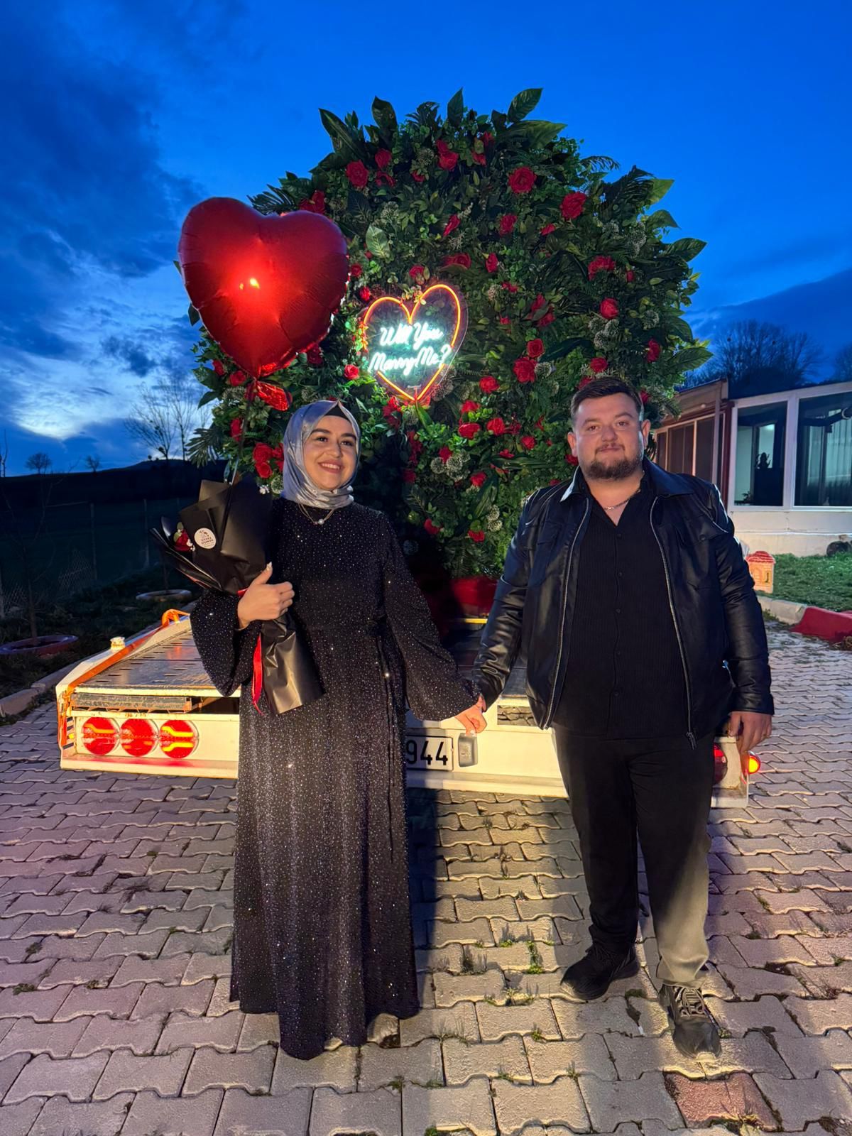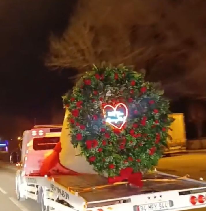 Oto kurtarıcı üzerine yerleştirdiği dev buketle evlilik teklifi etti