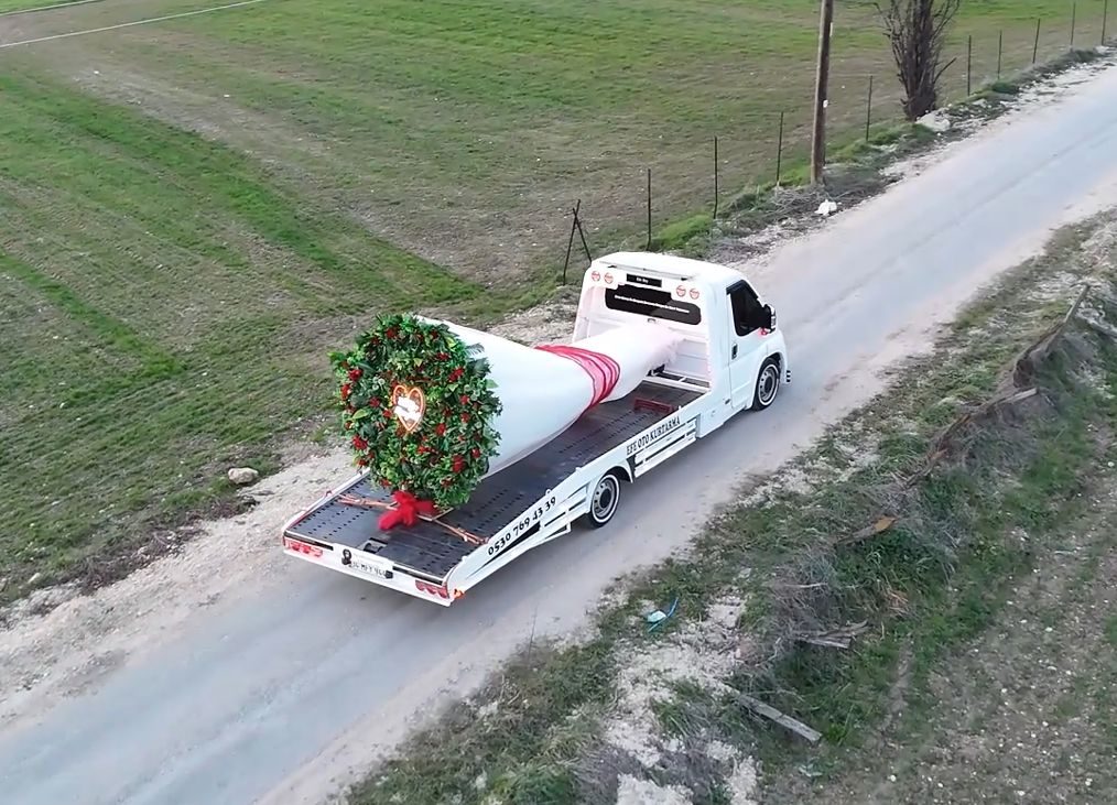 BOLU'nun Mudurnu ilçesinde oto kurtarıcı Tolga Efe, hazırladığı dev çiçek buketini oto kurtarıcıya yükleyerek kız arkadaşı Emine Rana'ya evlilik teklif etti.