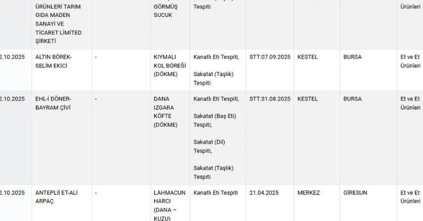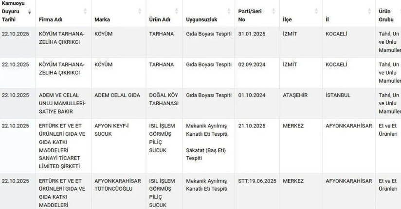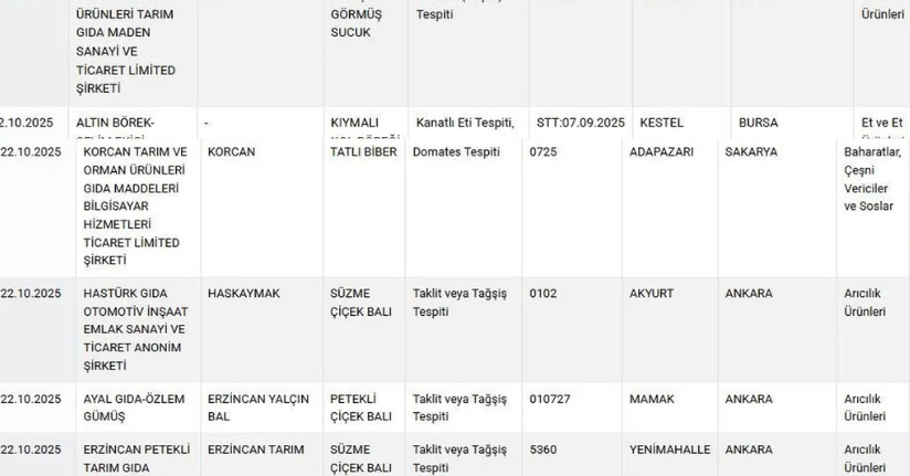Güncellenen listede lahmacundan bala kadar birçok üründe halkın sağlığını tehlikeye düşürecek ürünler tespit edildi.